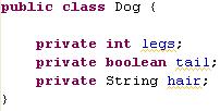 First of all, these variables were created by putting the word private in front of them. This means that these variables can only be used inside of the dog object. Simple as that. Then I create four variables, one to store the number of legs, one to tell me if the dog has a tail, another to tell me what type of hair the dog has, and the last variable tells me the sound this dog makes.