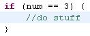 Notice how the last part is missing the if. This is what is called an else. This is different from an else if because it will execute only when all other conditions fail. In this case I'm saying that if num is not less than three, and it is not equal to three, then it must be greater than 3, so I just used an else to show that. Unlike else if, you may only use else at the very bottom of the chain of else if's and you may only use it once per chain of if statements. So, you could never have: