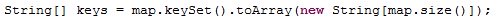 This is fairly tricky. The keySet method returns a Set. Then, that set is turned into an array of Strings by creating a new String that has a length that's the size of the HashMap. Then, that array is stored in an array called keys. The reason I'm creating an array of Strings is because the keys are all Strings from before.